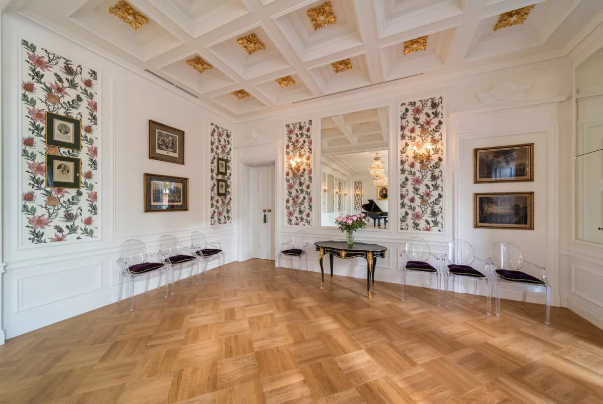 Stucco walls and elegant mirrors also create an unique atmosphere. This unique effect is complemented by numerous gildings on the ceiling and crystal chandeliers hanging above the heads of the audience. Sparse furniture provides a sense of space. Guests of the Fryderyk Concert Hall in Warsaw sit on designer chairs designed by Philipp Starck, while in the back of the room there is a table made in the style of Napoleon III.