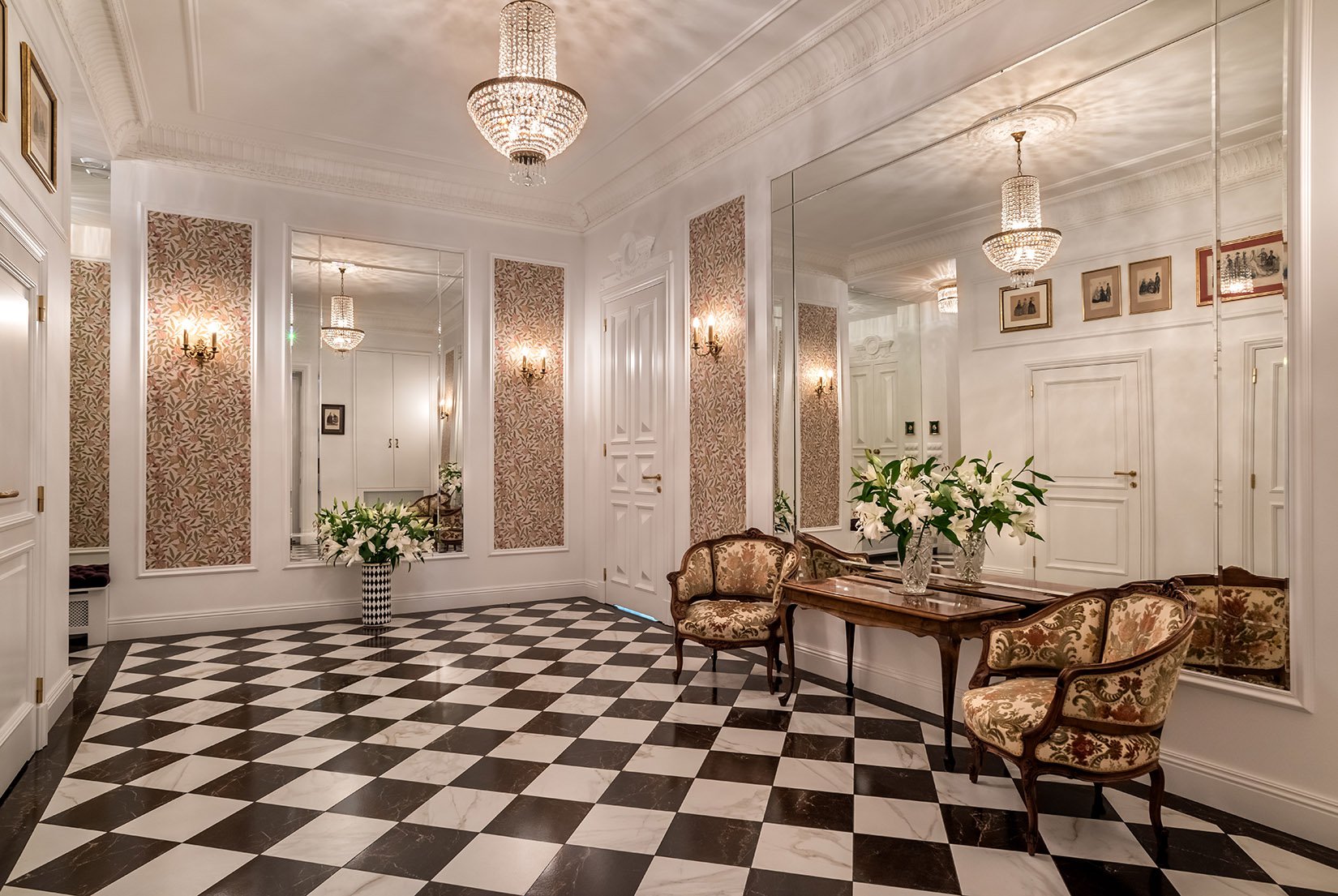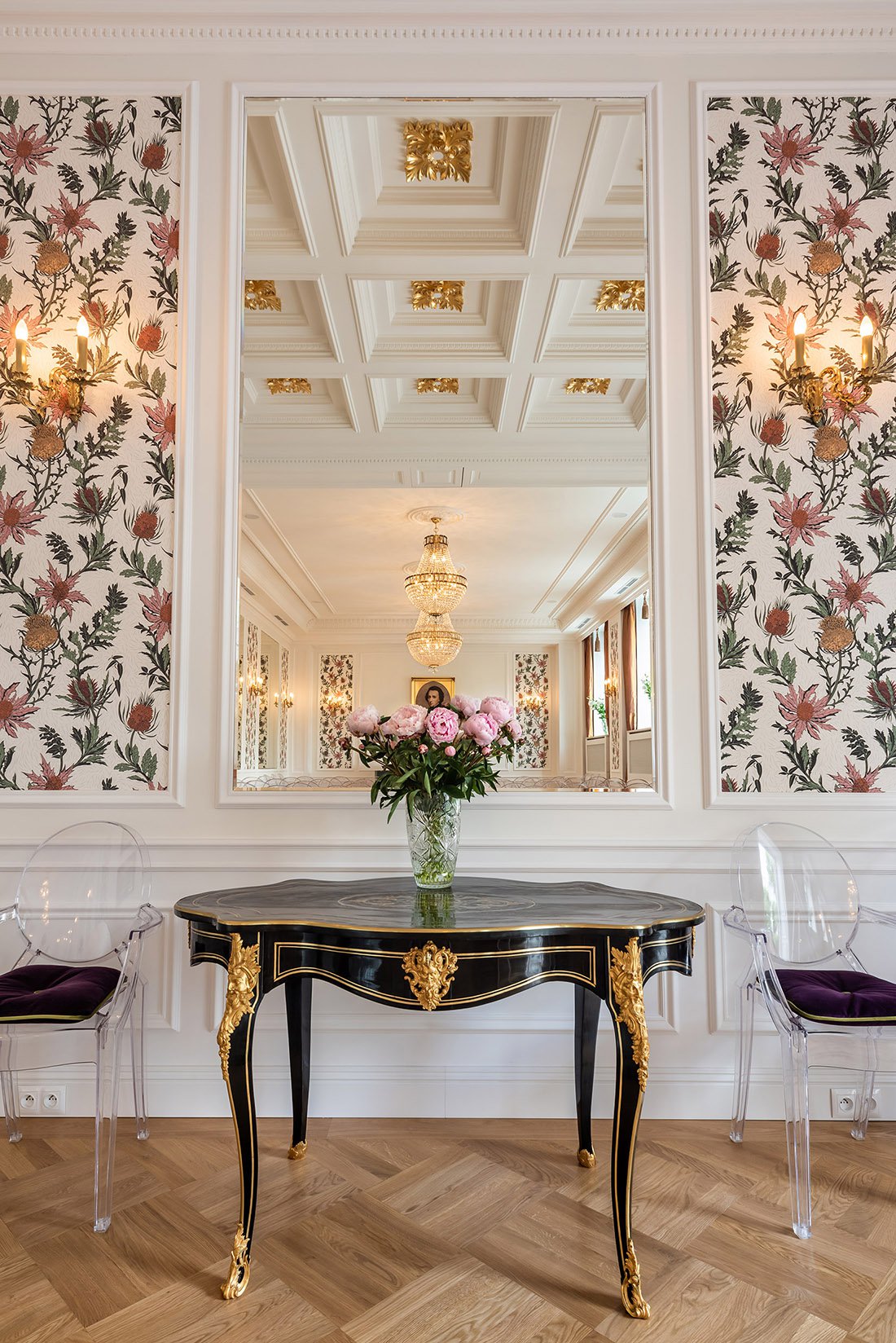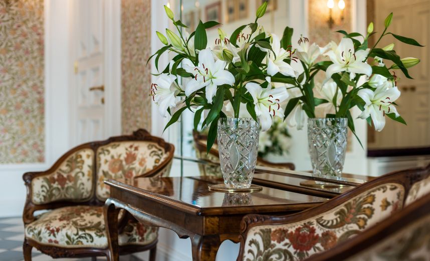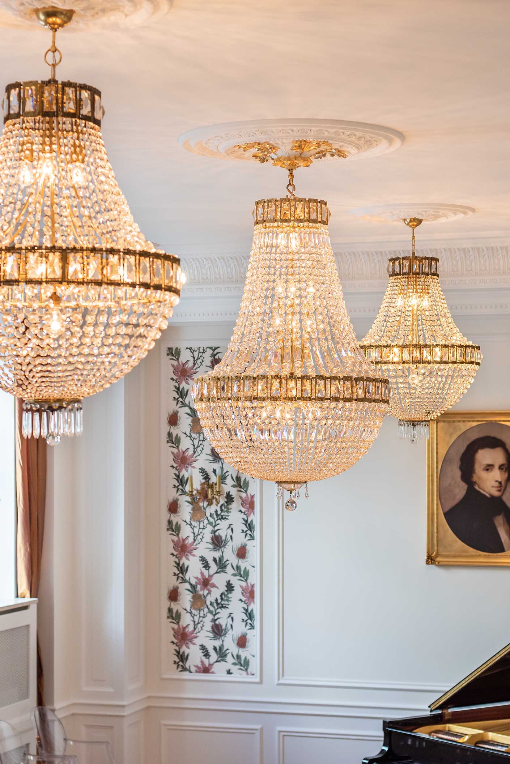 Stucco walls and elegant mirrors also create an unique atmosphere. This unique effect is complemented by numerous gildings on the ceiling and crystal chandeliers hanging above the heads of the audience. Sparse furniture provides a sense of space. Guests of the Fryderyk Concert Hall in Warsaw sit on designer chairs designed by Philipp Starck, while in the back of the room there is a table made in the style of Napoleon III.